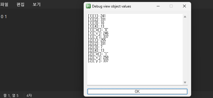 [1]["ID"] : 0 과 같이 반환된 것을 볼 수 있습니다. 위에 기초로 <이름> 작업을 해둬서 ID키에 반환이 된 것입니다
