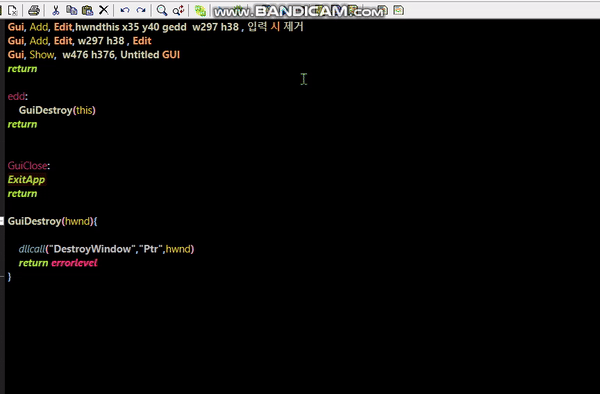 안녕하세요 오토핫키는 Gui 최초 구성할 때 v옵션으로 컨트롤의 내용을 수 있는 변수를 지정하는 옵션과,g옵션으로 라벨을 구성해서 Event를 감시하는 옵션이 있습니다. 다양한 프로그램을 만들다보면 Gui를 제거 후 다시 생성을 해야되는 상황이 생길 수 있습니다같은 컨트롤 변수나 라벨 이름을 가진 컨트롤 생성은 불가능하기 때문에 이러한 상황에 사용을 하기 위한,라이브러리를 제공 해드리기 위해 글을 작성했습니다 기본 기능중에는 Gui전체를 Destroy하는 방법은 있으나,Gui 중 일부만 삭제 하는 기능은 존재하지 않습니다 하지만 아래 코드를 이용하면 컨트롤의 핸들만으로 특정 컨트롤을 삭제할 수 있습니다영상 및 예제를 보고 참고 해주세요 감사합니다 Gui, Add, Edit,hwndedit1 x35 y4..